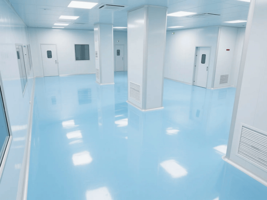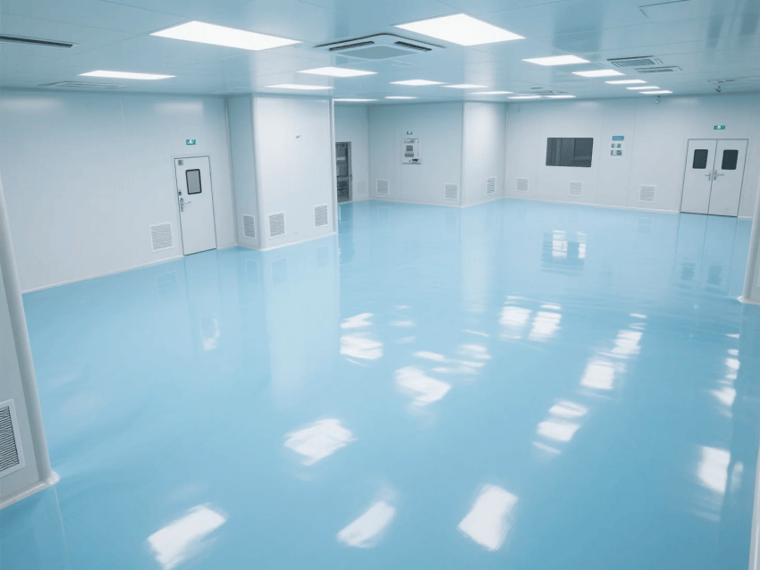 地面系統(tǒng)采用3mm厚環(huán)氧防靜電自流平地坪,表面電阻穩(wěn)定在10^6-10^9Ω范圍,耐磨系數(shù)達(dá)0.6以上,滿足電子元器件生產(chǎn)的防靜電要求。吊頂系統(tǒng)配置FFU+HEPA過濾單元組合,換氣次數(shù)≥25次/小時(shí),維持穩(wěn)定的單向流氣流組織。功能區(qū)域通過淺藍(lán)色環(huán)氧樹脂劃線區(qū)分,設(shè)備基座采用啞光白不銹鋼包邊,既確保密封性又強(qiáng)化視覺引導(dǎo)。