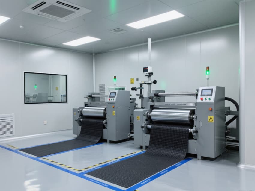 車間以銀灰色抗菌金屬彩鋼板搭建墻體與吊頂,搭配淺灰色防靜電環(huán)氧地坪,金屬質(zhì)感的建材兼具抗電解液腐蝕、易清潔特性,地面藍(lán)色防靜電標(biāo)識線清晰劃分涂布、卷繞、裝配等工序區(qū)域。頂部高效過濾器與定向?qū)恿飨到y(tǒng),實(shí)現(xiàn)每小時(shí)18-22次空氣置換,配合除濕機(jī)組將濕度精準(zhǔn)控制在20-30%RH,避免水分影響電芯性能。?