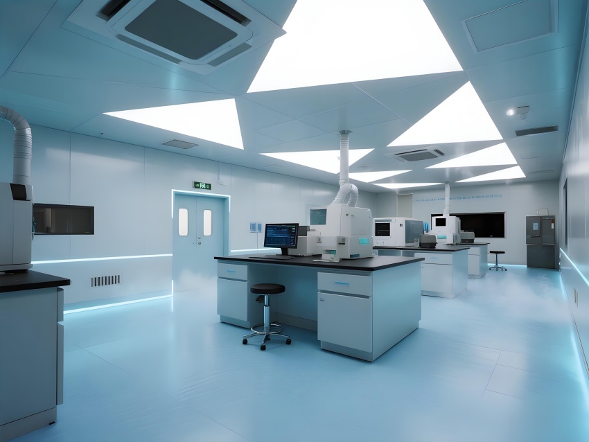 本實(shí)驗(yàn)室以"絕對(duì)環(huán)境控制"為核心設(shè)計(jì)理念,整體采用冰川藍(lán)與鈦白灰的漸變配色。墻面嵌入式環(huán)境參數(shù)監(jiān)測(cè)屏實(shí)時(shí)流動(dòng)著翡翠綠數(shù)據(jù)流,與頂棚矩陣排列的微孔送風(fēng)口形成科技韻律。核心實(shí)驗(yàn)區(qū)采用圓弧形防結(jié)露玻璃隔斷,內(nèi)置百級(jí)潔凈層流罩。地面鋪設(shè)防靜電陶瓷鋼板,接縫處嵌入LED環(huán)境達(dá)標(biāo)指示燈。設(shè)備區(qū)裸露的銀色保溫管道與藍(lán)色冷媒管構(gòu)成工業(yè)美學(xué)展陳,智能除濕機(jī)組通過(guò)半透明外殼展示內(nèi)部冷凝過(guò)程。數(shù)據(jù)中控室配備270°曲面監(jiān)控屏,懸浮粒子濃度以動(dòng)態(tài)星云圖呈現(xiàn)。空間通過(guò)嚴(yán)謹(jǐn)?shù)膸缀畏指钆c流體力學(xué)曲線結(jié)合,在極致環(huán)境控制要求下,打造出兼具科研嚴(yán)肅性與星際艙未來(lái)感的頂級(jí)實(shí)驗(yàn)環(huán)境。