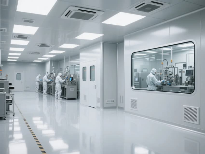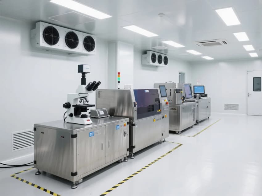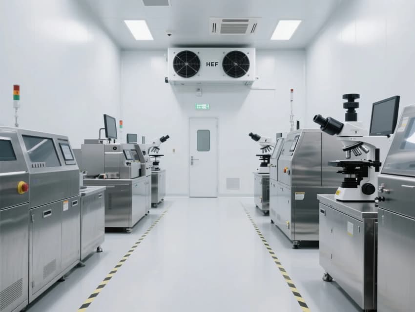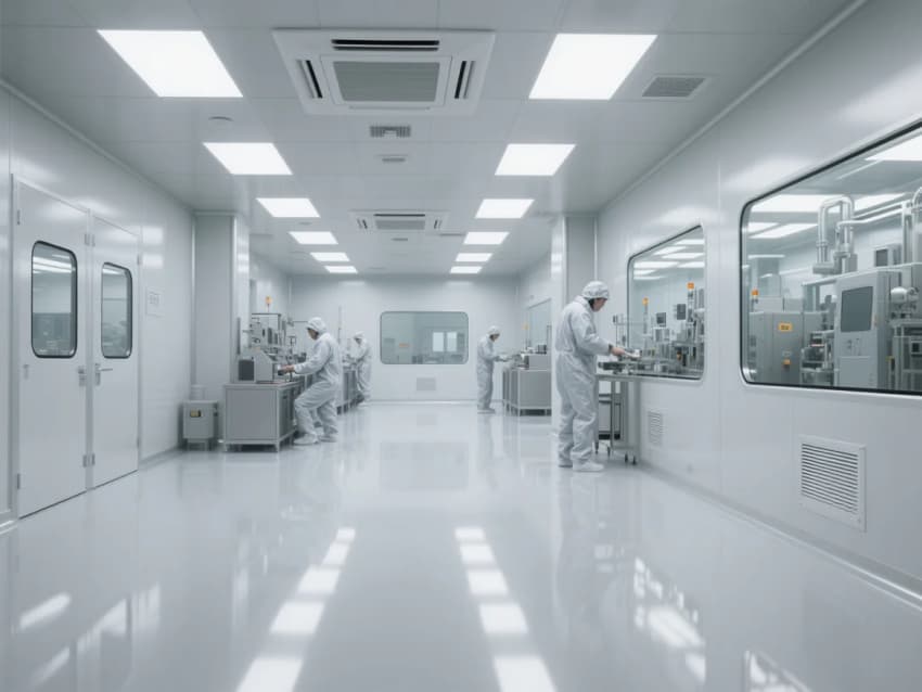 本方案采用"科技極簡主義"風(fēng)格,以ISO 5級(萬級)潔凈標(biāo)準(zhǔn)為核心??臻g設(shè)計(jì)強(qiáng)調(diào)線性流動(dòng)感,灰白主色調(diào)搭配防靜電環(huán)氧樹脂地坪,墻面采用抗菌彩鋼板。頂棚網(wǎng)格化FFU送風(fēng)單元配合側(cè)墻回風(fēng),形成垂直層流。功能分區(qū)明確,包含更衣緩沖間(Class 7)、核心生產(chǎn)區(qū)(Class 5)、設(shè)備維護(hù)通道。智能控制系統(tǒng)集成溫濕度(22±1℃/45±5%)、壓差(+10Pa)、粒子監(jiān)測顯示。創(chuàng)新采用LED黃光照明減少光致氧化,設(shè)備基座增設(shè)主動(dòng)減震系統(tǒng)。設(shè)計(jì)融合人機(jī)工程學(xué),防靜電設(shè)施覆蓋率100%,通過藍(lán)色光帶引導(dǎo)潔凈動(dòng)線,實(shí)現(xiàn)功能性與未來感的完美平衡。