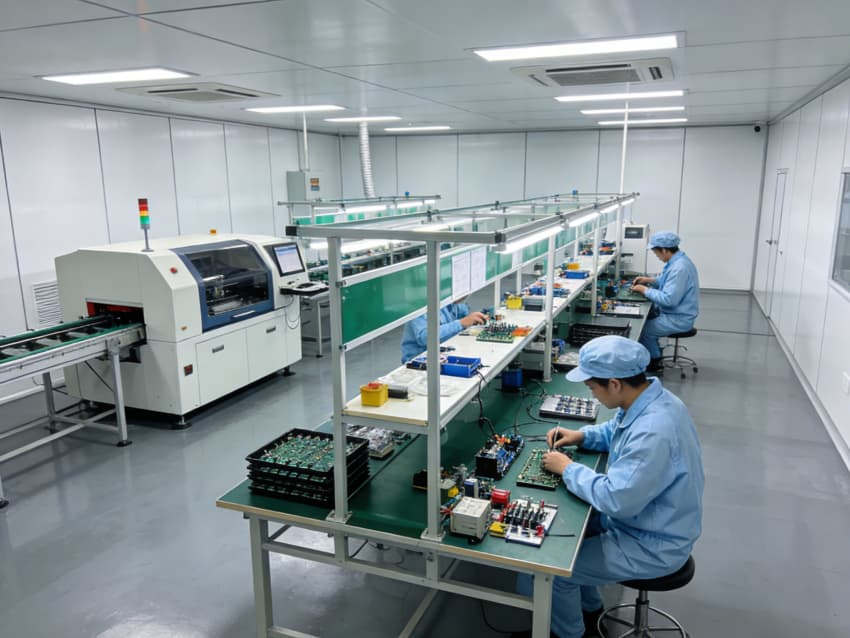 手工組裝與測試區(qū):采用模塊化防靜電工作臺布局,每個工位配備獨立電源接口與靜電手環(huán)接地端,線性燈帶提供均勻照明,旁側(cè)通風(fēng)系統(tǒng)有效驅(qū)散焊接產(chǎn)生的熱量與煙塵。