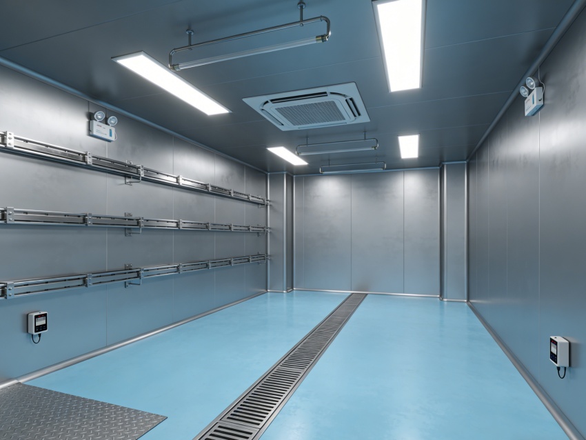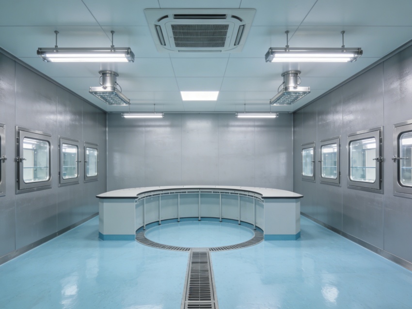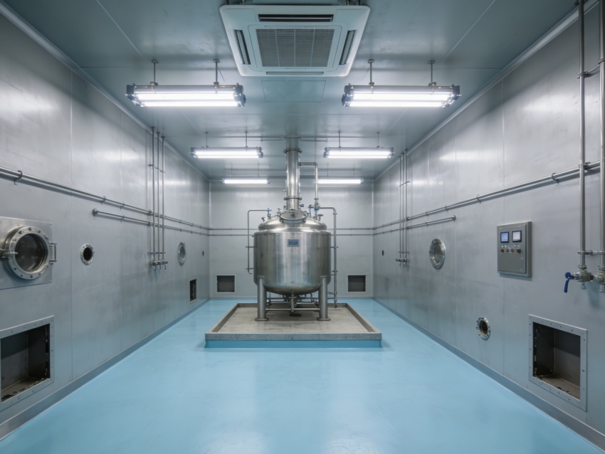 車間內(nèi)部統(tǒng)一采用淺藍色抗菌防靜電地坪搭配灰色無縫工業(yè)級墻面。淺藍色地面選用食品級環(huán)氧材質(zhì),具備優(yōu)異的耐腐蝕性與易消殺性能,可耐受各類清潔試劑,同時有效規(guī)避靜電干擾;灰色墻面采用抗菌涂層無縫拼接,搭配圓弧墻角設(shè)計,徹底杜絕積塵死角,有效降低微生物滋生風(fēng)險,全面適配無菌環(huán)境嚴苛管控需求。
