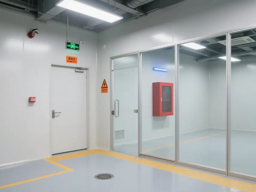 車間內配備了多個紅色的消防箱,確保消防安全。墻壁上還設有緊急出口標志,為人員在緊急情況下提供指引。車間內的門大多是玻璃門,便于觀察內部情況。