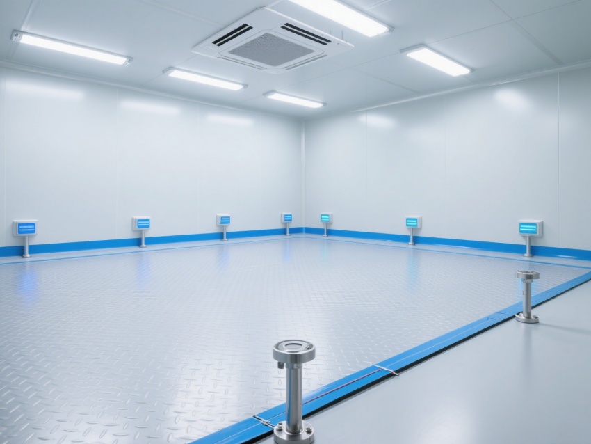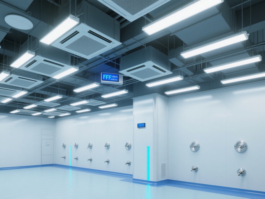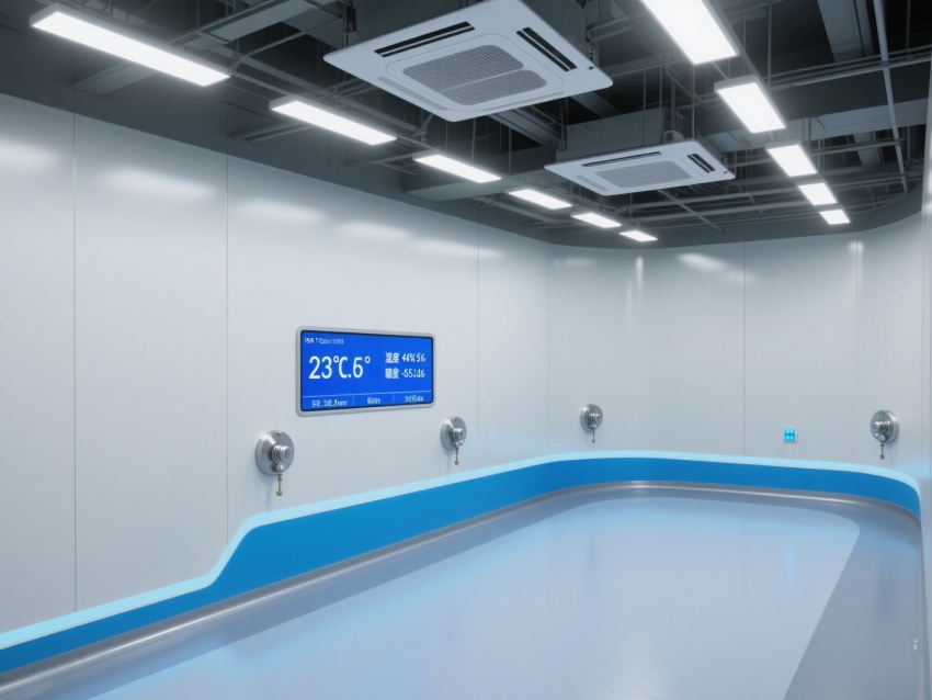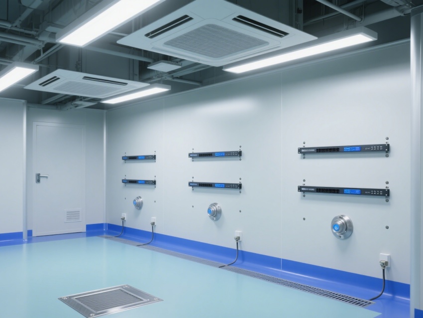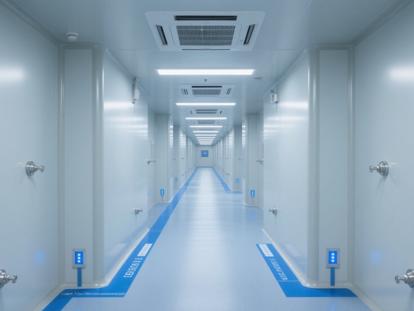 走廊采用一體化潔凈設計,地面藍色標識線清晰規(guī)劃動線,各類管線與設備布局兼顧功能性與美觀性。整體工程通過材質選用、空氣凈化、智能監(jiān)控的協(xié)同,為芯片檢測提供了超潔凈、高穩(wěn)定的專業(yè)環(huán)境,有力保障芯片檢測的精度與可靠性,是芯片研發(fā)與質量把控的核心技術支撐單元。