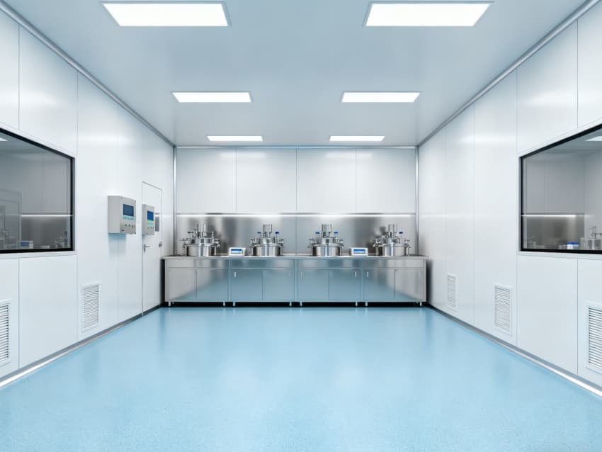 在環(huán)境控制層面,本設(shè)計(jì)彰顯卓越優(yōu)勢(shì):地面選用淺藍(lán)色防滑防腐蝕環(huán)氧材料,不僅具備優(yōu)異的抗藥劑侵蝕性能,而且清潔消毒極為便捷;四周白色抗菌墻面采用圓弧轉(zhuǎn)角工藝,有效規(guī)避粉塵積聚風(fēng)險(xiǎn),搭配全吊頂潔凈送風(fēng)系統(tǒng),可將潔凈度穩(wěn)定維持在萬(wàn)級(jí)標(biāo)準(zhǔn),精準(zhǔn)契合藥劑生產(chǎn)對(duì)微環(huán)境的嚴(yán)苛需求。?